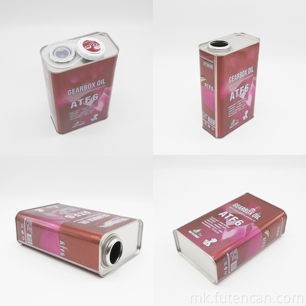 Квадратната лимена конзерва за моторно масло од 1 литар е 116*60*178 mm, се користи на боја, моторно масло, лубрикант, дупката е искористена пластична капа од 42 mm. Пластично заврткано капаче од 42 мм и капак за лесно отворање. Нашиот MOQ е 1000 парчиња со печатење во боја CMYK 4, печатење во боја со пантон. Можеме да произведеме квадратна лимена конзерва со различна големина. Во споредба со другите материјали за пакување, лименките имаат очигледни предности. Зрела технологија и висока производна ефикасност: Историјата на производство на лимени лименки е долга, а има комплетен сет на опрема за производство усогласена со зрелата технологија, која има висока производна ефикасност и може да ги задоволи потребите за пакување на различни производи.